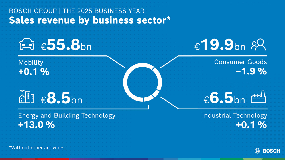 (MobileWorld.vn) -Trong bối cảnh căng thẳng địa chính trị và các rào cản thương mại gia tăng, Tập đoàn Bosch đặt mục tiêu thúc đẩy tăng trưởng toàn cầu thông qua năng lực đổi mới sáng tạo trong năm tài chính 2026. Công ty tiếp tục duy trì mức đầu tư cao vào các lĩnh vực chiến lược, với riêng năm 2025 đã chi khoảng 12 tỷ euro cho nghiên cứu và phát triển (R&D). Bosch kỳ vọng đạt tăng trưởng doanh thu từ 2–5% và biên lợi nhuận hoạt động từ 4–6% trong năm 2026.