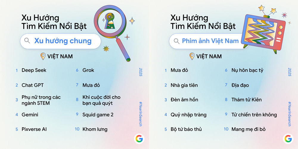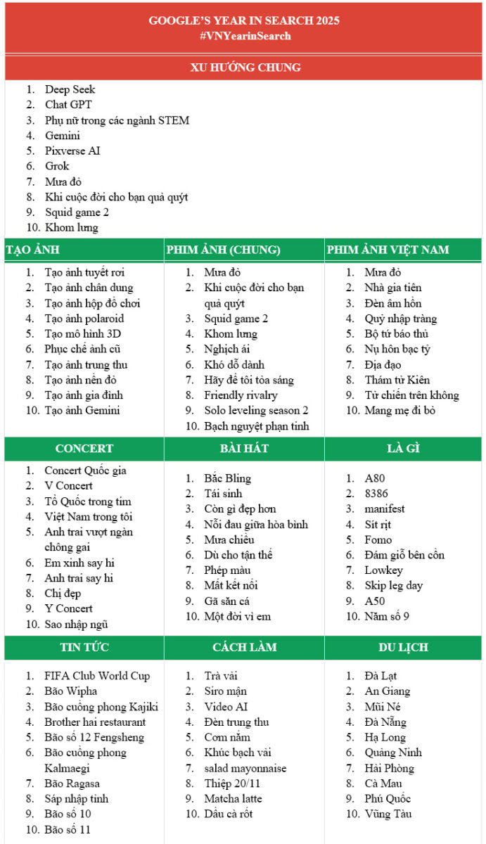 (MobileWorld.vn)) – Google vừa công bố Year in Search 2025 với 10 chủ đề gồm Xu hướng chung, Tạo ảnh, Phim ảnh, Phim Việt Nam, Concert, Bài hát, Tin tức, Cách làm, Là gì và Du lịch. Danh sách phản ánh những gì người Việt quan tâm nhất trong năm, cho thấy sự nổi lên mạnh mẽ của AI và nội dung mang đậm bản sắc văn hóa – lịch sử.