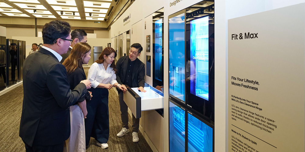 Ở khu vực nhà bếp, LG tập trung vào các giải pháp tối ưu không gian, yếu tố được quan tâm phổ biến tại nhiều đô thị Châu Á. Dòng tủ lạnh mới với thiết kế Fit & Max sử dụng bản lề Zero Clearance, cho phép đặt tủ âm tường mà cửa vẫn mở được hoàn toàn. Thiết kế này không chỉ tiết kiệm không gian mà còn tối đa dung tích sử dụng.