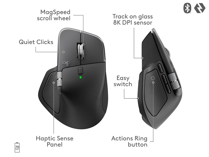 Sức mạnh của MX Master 4 được củng cố bởi bánh lăn MagSpeed Scroll Wheel có khả năng cuộn tới 1.000 dòng mỗi giây, cảm biến 8.000 DPI theo dõi chính xác trên mọi bề mặt kể cả kính, cùng khả năng nhấp chuột êm hơn 90% so với thế hệ trước. Chuột hỗ trợ sạc nhanh USB-C, chỉ cần một phút sạc là có thể sử dụng ba giờ và khi sạc đầy, thời lượng pin kéo dài đến 70 ngày. Người dùng có thể kết nối linh hoạt tối đa ba thiết bị, chuyển đổi tức thì giữa laptop, desktop và tablet thông qua Bluetooth hoặc USB-C dongle, đồng thời truyền tệp giữa các thiết bị bằng phần mềm Logi Options+.
