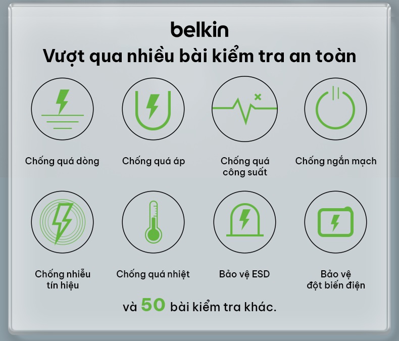 Với iPhone 17 Series, Apple nâng cấp pin và tối ưu thiết kế, kéo theo nhu cầu phụ kiện tương thích hoàn hảo, sạc nhanh và an toàn. Belkin mang đến hệ sinh thái phụ kiện đạt chuẩn, trong đó công nghệ bảo vệ nhiều lớp giúp kiểm soát nhiệt độ, chống quá áp và quá dòng để bảo vệ pin.