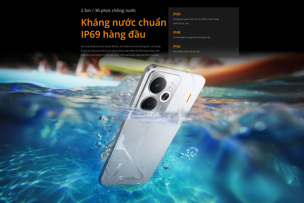 realme 14 5G đạt chuẩn chống nước và bụi IP69/IP68/IP66, sẵn sàng đồng hành cùng người dùng ở mọi môi trường khắc nghiệt. Hệ thống làm mát Bionic với buồng hơi VC giúp duy trì nhiệt độ ổn định, giảm nhiệt SOC đến 20°C – cao hơn gấp 10 lần các đối thủ cùng phân khúc.
